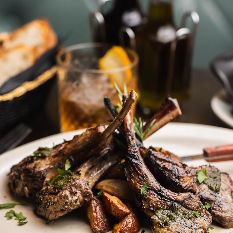 Colorado lamb chops, 3pc, served with roasted potatoes, rosemary au jus, pesto