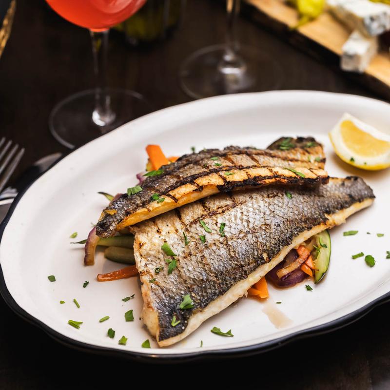 Charred salmon with cherry tomatoes, asparagus and cauliflower with dijon sauce